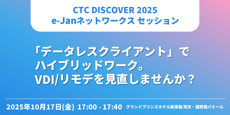 CTC DISCOVER 2025内 e-Janネットワークス セッション:「データレスクライアント」でハイブリッドワーク。VDI/リモデを見直しませんか?